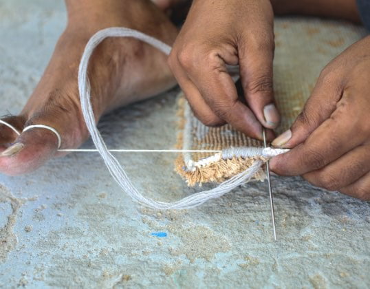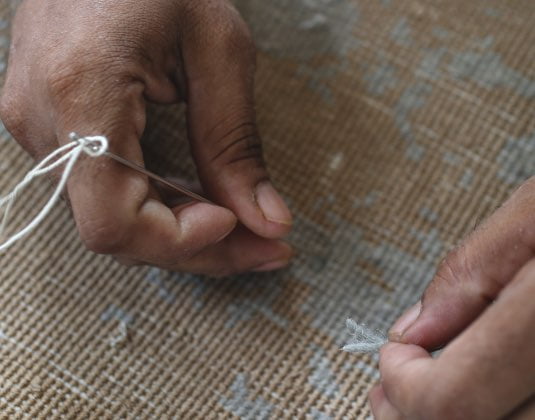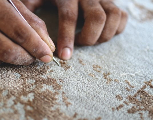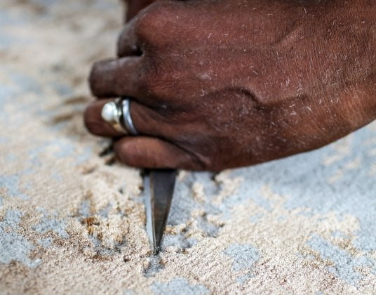 Elle düğümleme işlemi kesin olmadığı için, ipliğin değişen genişliği ve her düğümdeki farklılıklar, halıda ortaya çıkması amaçlanan tasarımın eğrilmesine neden olur. Bu bükülme, düğüm hattının dokuma tezgahından çıktığında düz olmamasından kaynaklanır. Bitirme merkezindeki ustalar, çarpık parçaları ölçer ve ardından deseni hizalamak, çözgü ve atkı boyunca düğümleri atmak için büyük bir demir çivi ve çekiç kullanır. Bu işlem oldukça zaman alıcı ve gürültülüdür. Desenin mükemmel görünmesini sağlamak, ustanın hassasiyetini gerektirir.