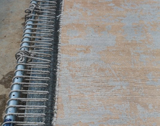 Yıkandıktan sonra, iplik, alttaki pamuk çözgü ve atkı küçülür. Halının sıkılaşmasına neden olur, ancak aynı zamanda boyutunu da değiştirir. Öngörülen boyuta getirmek için, kesin boyut gereksinimine uygun demir bir çerçeve üzerine gerilir. Düğümler sıkı ama bu işlemle dengeli ve eşit olur.